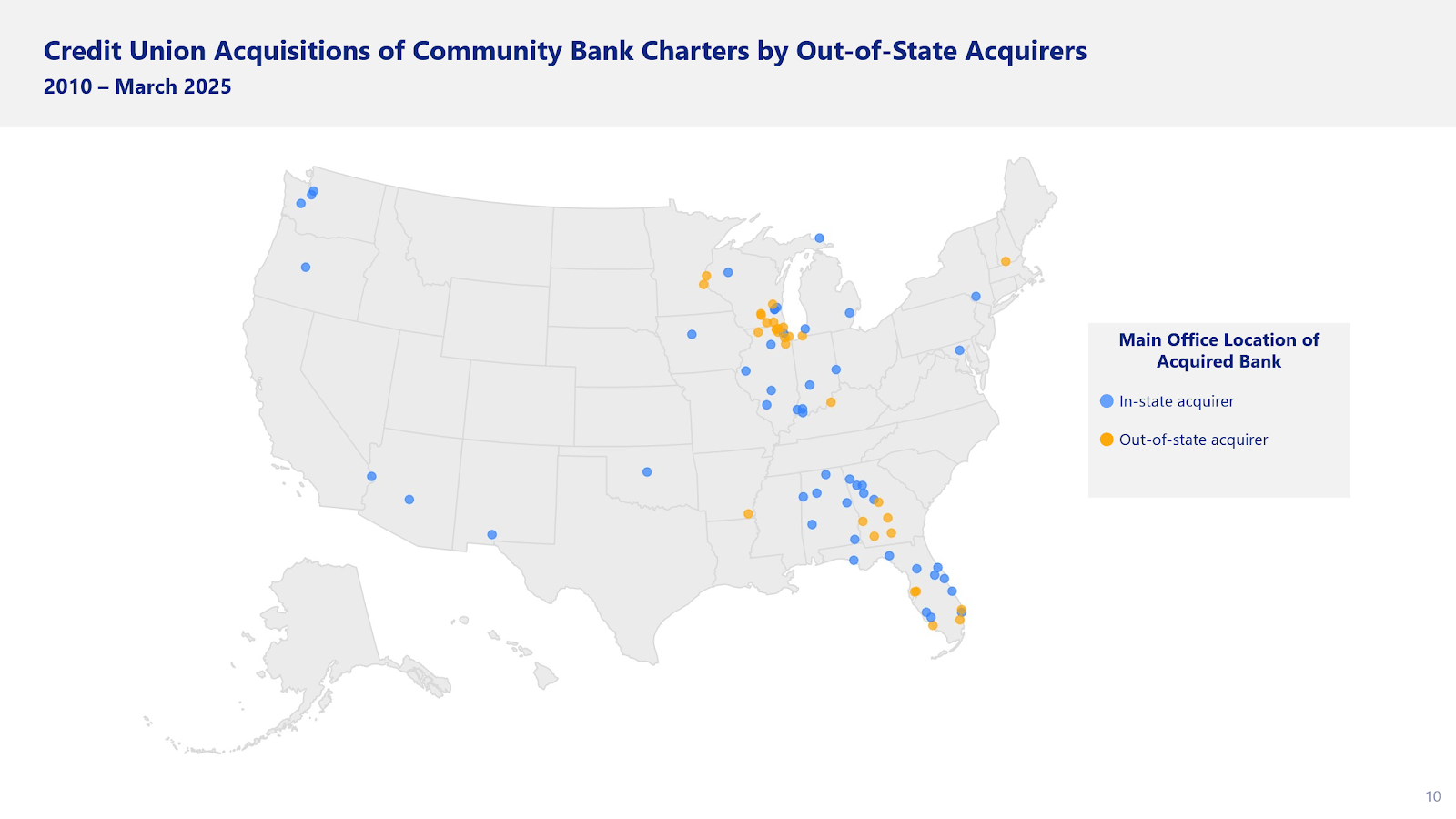 These transactions often involve the largest credit unions crossing state lines to absorb banks that serve communities well outside their field of membership. More than 80 percent have been driven by credit unions with more than $1 billion in assets.