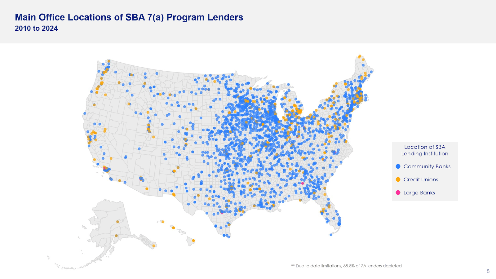 According to our analysis, community banks account for roughly 69.3% of SBA loans provided by banks and credit unions since 2010, compared to 2.8% from credit unions. In markets where community banks participated in SBA programs, those loans declined after a credit union acquisition nearly 80 percent of the time.
