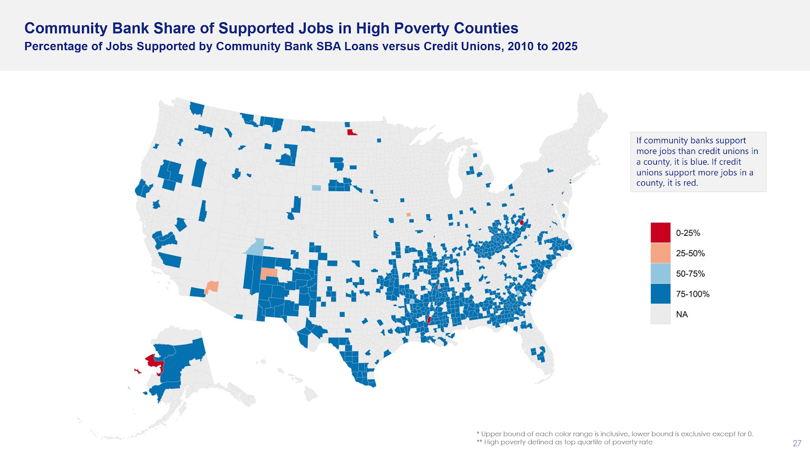 This community bank lending translated to supporting 433,227 jobs in high-poverty areas, compared to just 16,415 jobs supported by credit unions. Overall, community banks issued a total of $305 billion in SBA 7(a) and 504 loans, nearly 25 times more than credit unions. In rural regions, particularly in the Great Plains, the South, and Appalachia, community banks were often the only SBA lenders present.